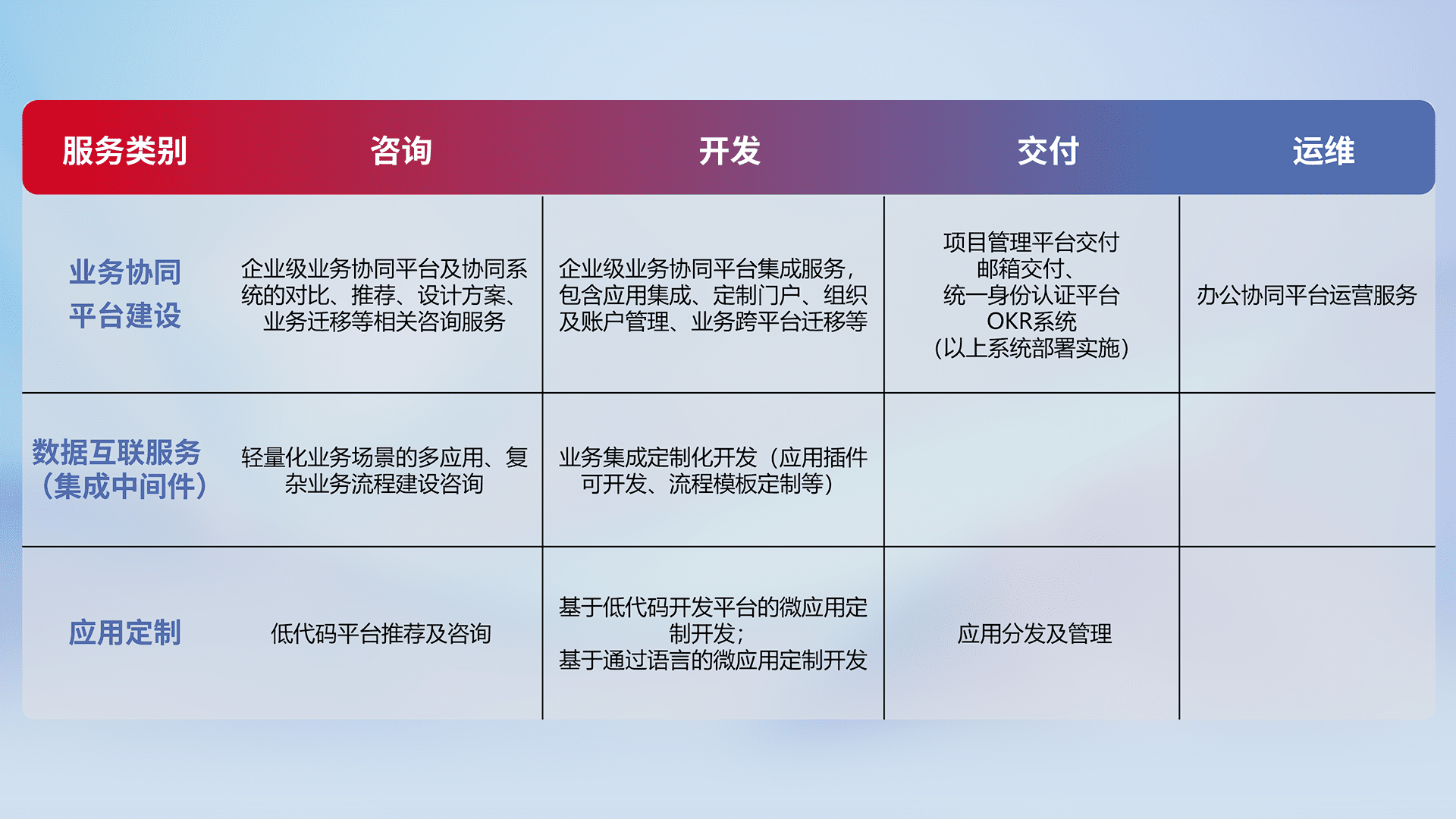 针对钉钉、、、企微、、、、IDaas等平台级产品提供产品的规划、、、方案、、、交付、、、、定制化开发等服务,,,,实现如统一协同办公、、、、智能客户服务、、、、混合会议管理、、智能数据查询、、、等业务场景,,实现数字化转型。。。