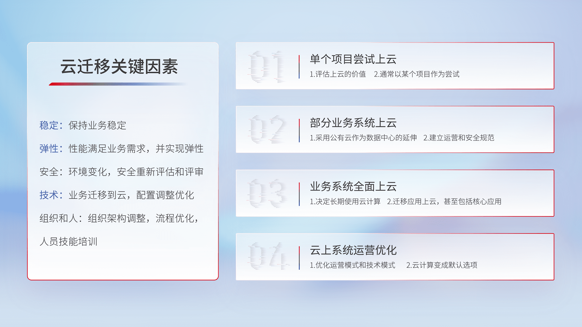 结合实际业务,,,从规划设计、、、云平台选型、、、云原生改造、、、数据迁移、、、、集成交付,,,迁移全过程为客户识别最佳上云路径,,,,做好风险识别管理,,,,设计网络架构、、、身份权限、、、、安全审计合规、、、操作审计、、日志审计、、、、监控告警策略、、、、多站点容灾设计等,,,对云上基础设施进行整体规划,,提升IT治理水平,,以满足弹性、、、高可用、、、、高性能的需求。。。