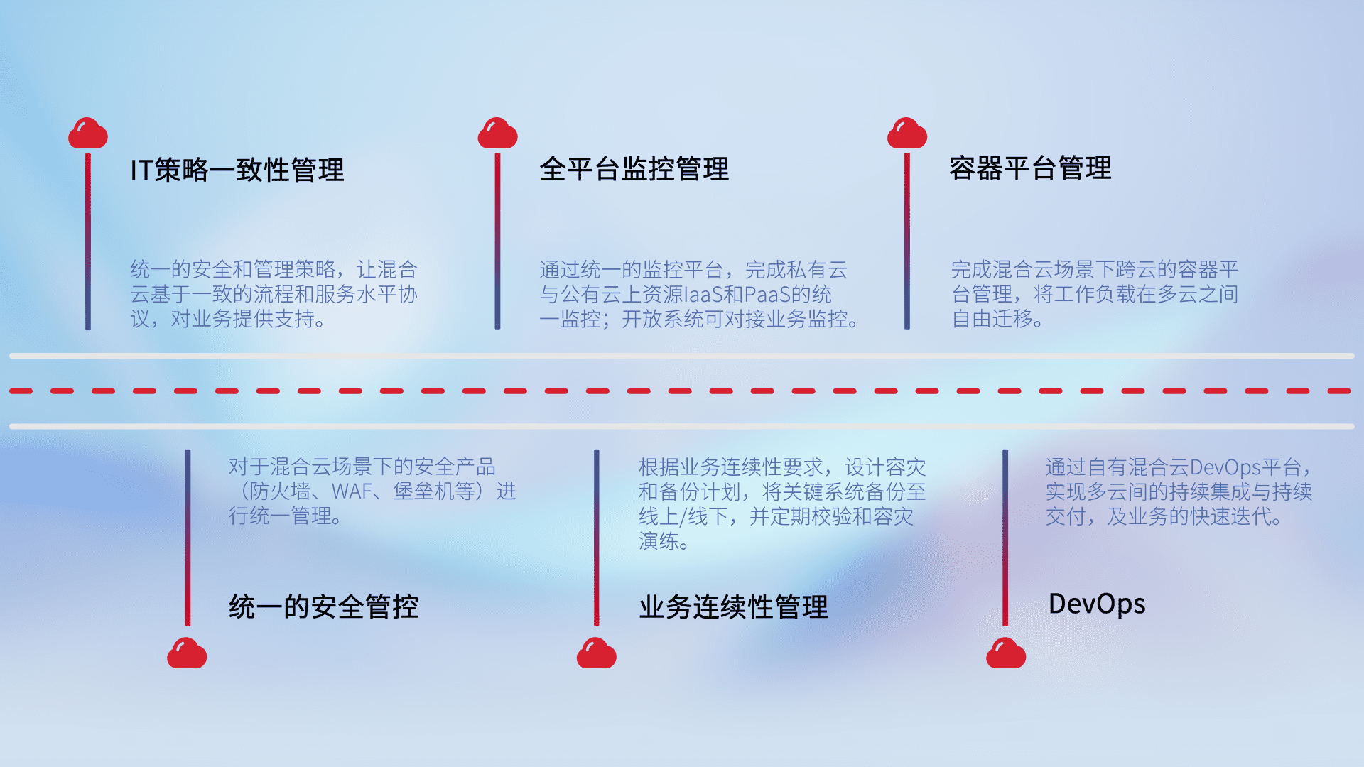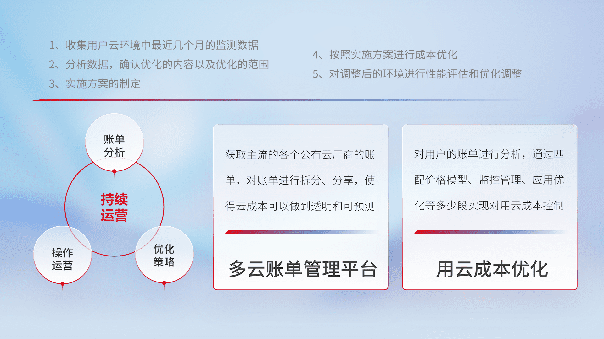 通过多云纳管,,以统一的资源数据模型把客户的云资源进行抽象和封装,,进而实现对多云资源的统一操作,,,保障云资源管理的可靠性、、、、稳定性与可用性。。。。量身定制化运维内容,,,配置、、、开发运维、、、补丁管理、、、、备份、、、监控、、、认证和访问管理、、、、审计和日常巡检等,,,保障在用云过程中的可靠度,,,,稳定度以及高可用率。。。