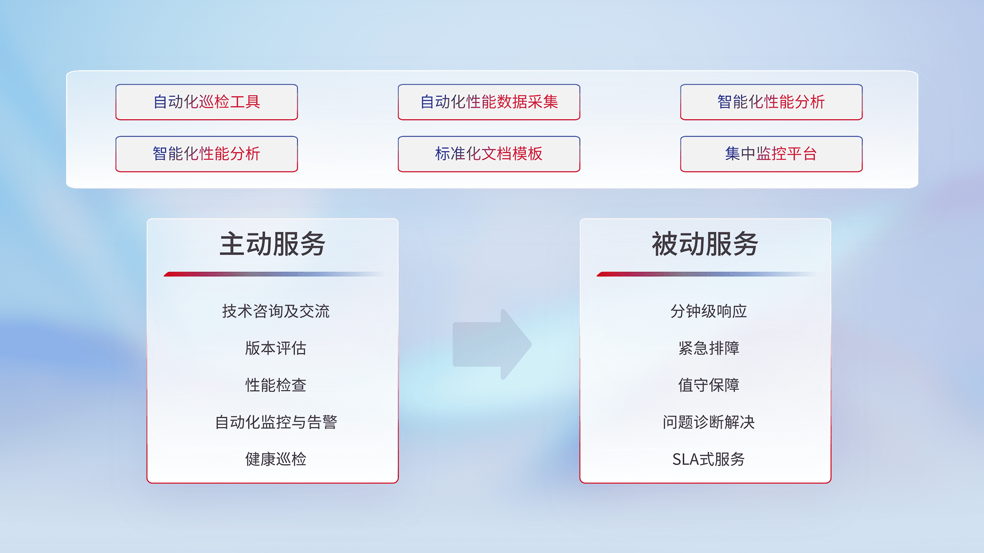 智能化工具和标准化文档,,保障服务质量,,,提供主动服务(包含技术咨询、、、版本评估、、、、性能检查、、自动化监控与告警、、、健康巡检)和被动服务包含(分钟级响应、、、、紧急排障、、、值守保障、、、、问题诊断解决、、、、SLA服务)。。。。